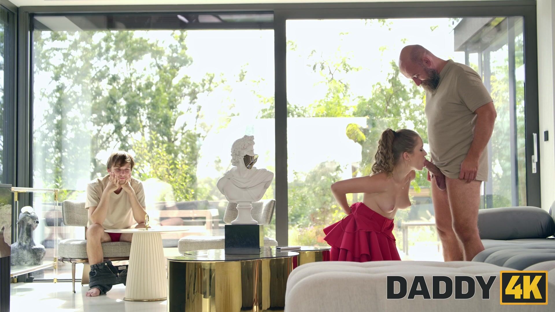 Накачанный отец решил помог своему сыну и тем более его девушке в укреплении их отношений. Он предложил красотке станцевать для него стриптиз, что бы заставить сына приревновать. Но молодая шлюха не удержалась и прильнула к члену мукжика и сделала его небрежный минет. Мужик затем повалил красотку на диван и принялся жестко трахать на глазах у её парня куколда.